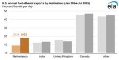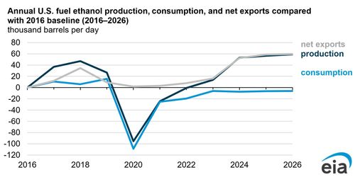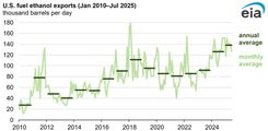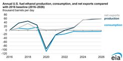 Data source: U.S. Energy Information Administration, Short-Term Energy Outlook, October 2025 Note: Net exports are virtually the same as exports because the United States imports a negligible amount of fuel ethanol.