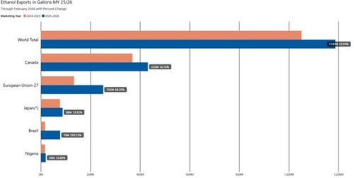 U.S. ethanol exports are up 13% so far in Marketing Year 2025/2026 according to a recent data release from the USDA. / SOUCE: USGBC