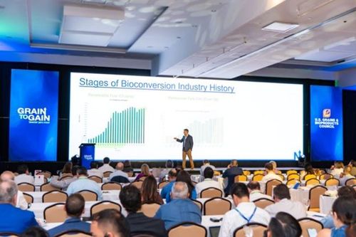 Pictured, POET Director of Protein, Ingredients and Business Development Derek Balk discusses advances in biotechnology. / SOURCE: USGBC